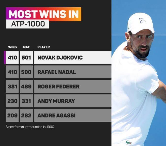 金年会体育本场比赛取得胜利的德约科维奇,以410场大师赛胜场追平了自己的老对手纳达尔,并列成为了在大师赛获胜场次最多的球员。同时这是德约的第501场大师赛比赛,超越了500场的纳达尔,成为了在大师赛参赛场次最多的球员。